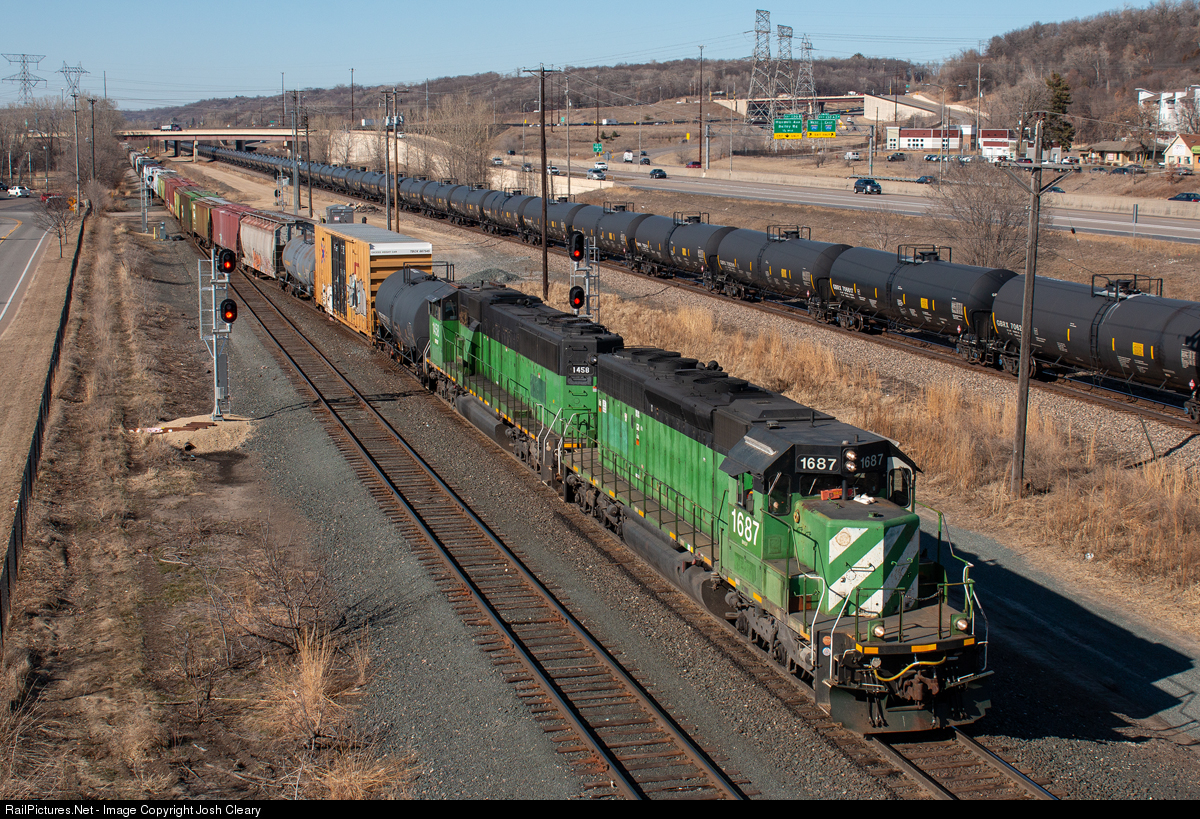 | A pair of patched BN units shove the BN-CP Delivery into the yard at Red Rock. This pair has been together for many months, and can be found working transfers and manifests out of Northtown. |