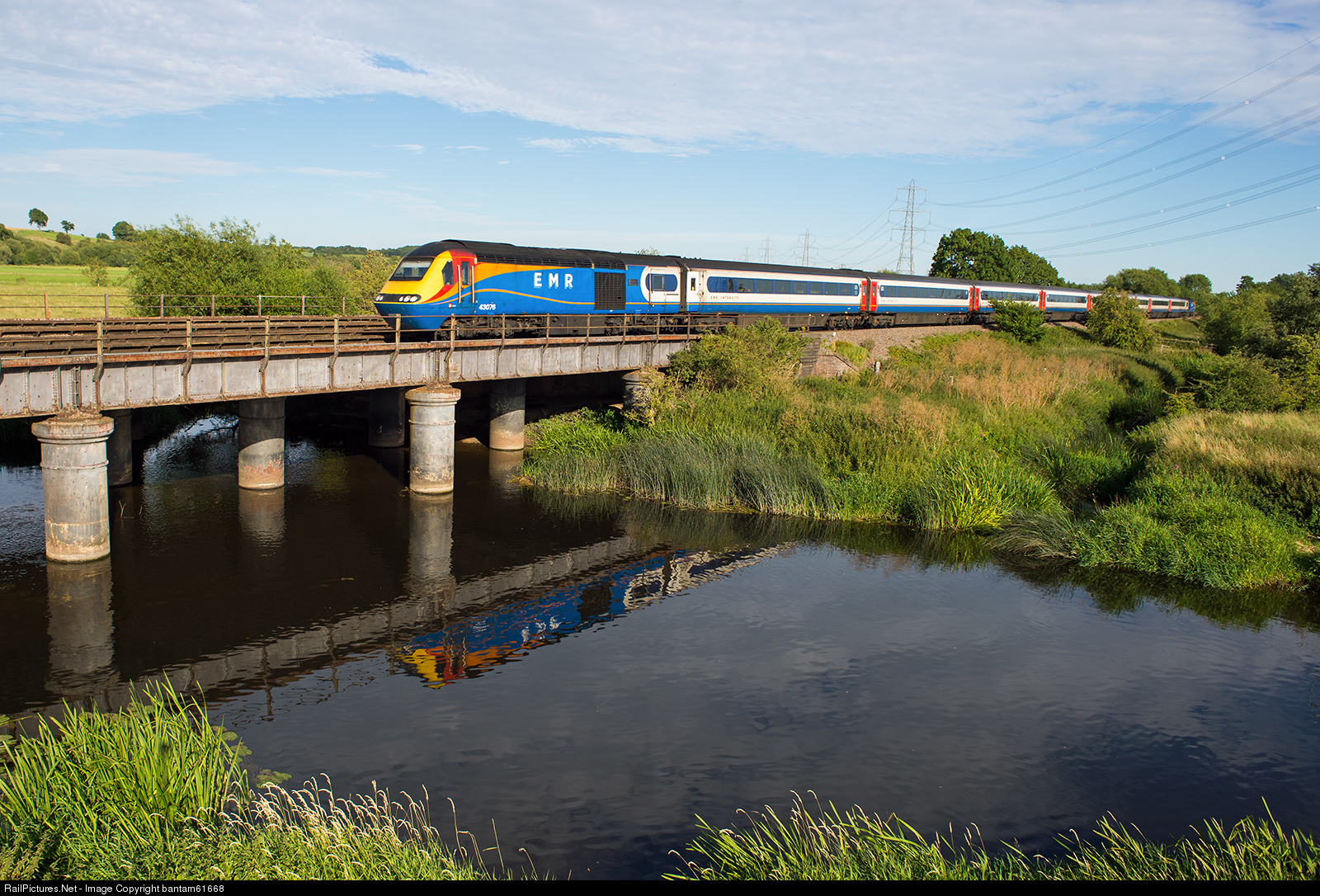 43076 races over the River Soar at Normanton with 1D53 16:34 London St Pancras to Nottingham (43059 on rear)