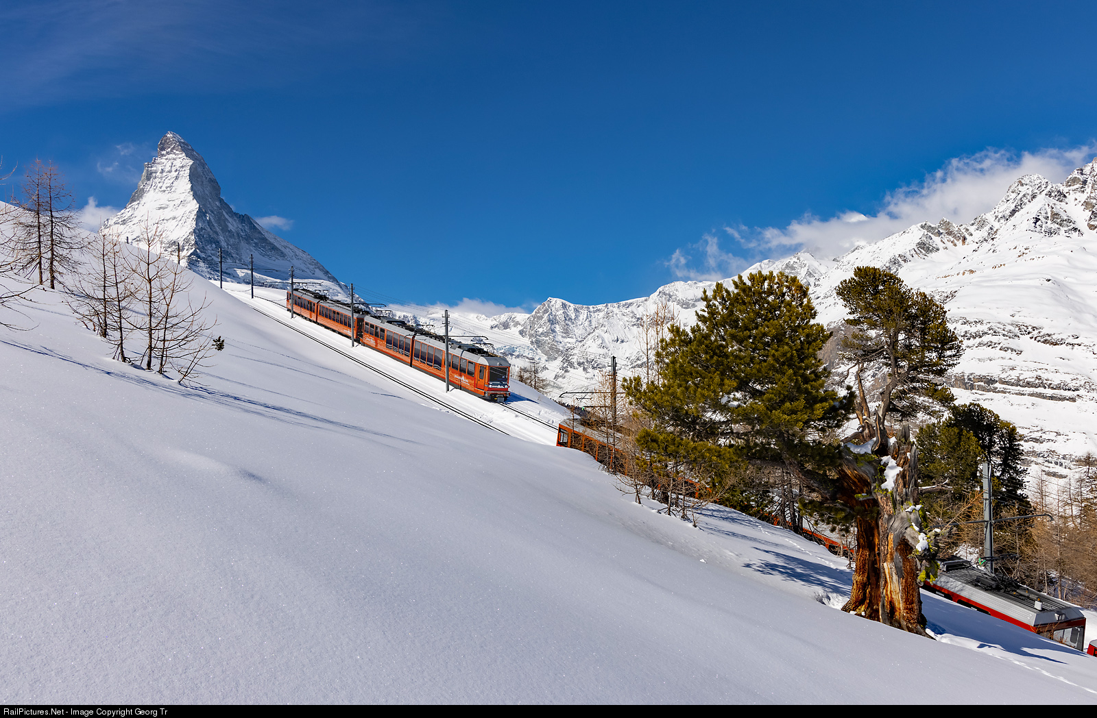 | Cogwheel railcars Bhe 4/8 # 3054 and Bhe 4/6 # 3084 of the Gornergrat Bahn (GGB) ("The Matterhorn Railway") in multiple control are running train CC 429 from Zermatt to the Gornergrat between Riffelalp and Riffelberg. On the other track, train CC 226 is going down to Zermatt. In the background the 4478 meter high Matterhorn. |