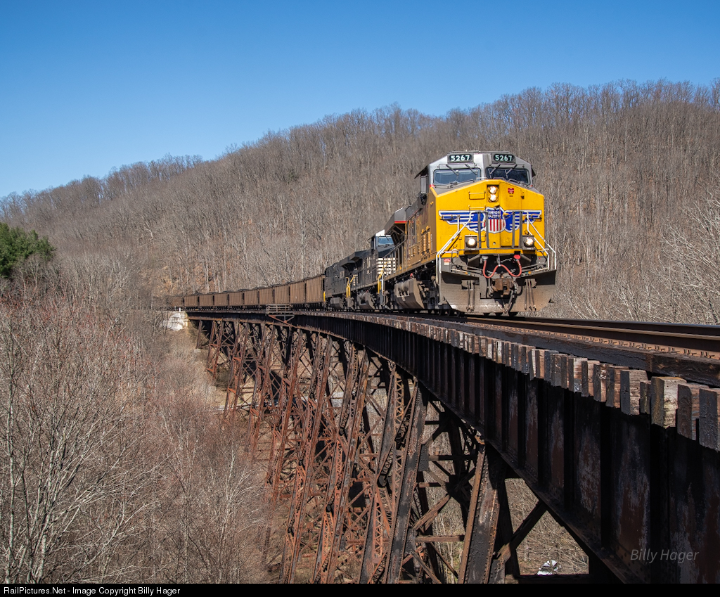 | Kanawha River Railroad train KN34 crosses Sweeneysburg Trestle near Beckley, WV on the former NS/Virginian Princeton-Deepwater District this with a loaded coal train for Elmore Yard |