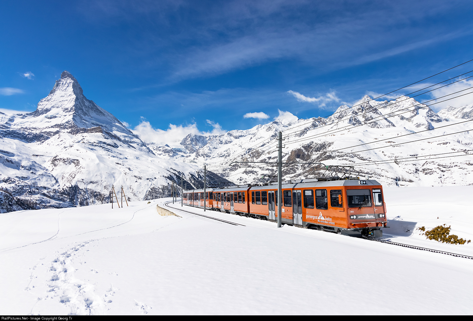 | Cogwheel railcars Bhe 4/8 # 3053 and Bhe 4/6 # 3083 of the Gornergrat Bahn (GGB) ("The Matterhorn Railway") in multiple control are running train CC 236 from the Gornergrat to Zermatt near Riffelboden. In the background the 4478 meter high Matterhorn on the left and Dent Blanche (partly behind clouds), Ober Gabelhorn and Wellenkuppe on the right. |