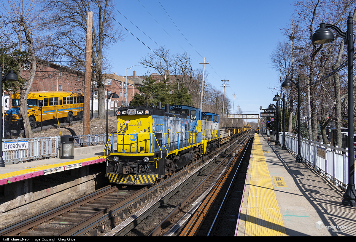 "Track Renewal at Broadway" Long Island Rail Road MP15AC 171 leads the Harsco Track Renewal Train through Broadway Station on the Port Washington Branch. Harsco's Track Renewal Machine removes and replaces crossties, reclaims spikes, collects rail anchors and removes the old rail while installing new rail all in one shot. Over the course of a few days, the LIRR renewed Track 1 on the Port Washington Branch from BAY Interlocking in Bayside to SHEA Interlocking near Citi Field in Queens.