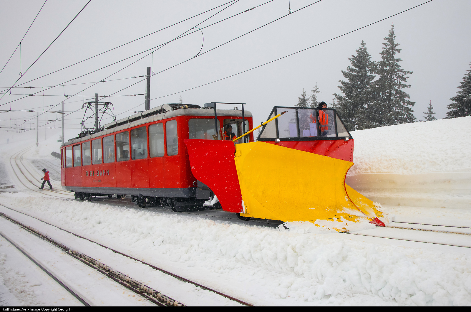 Large snow plow X # 102 of the Rigi Bahnen (line from Vitznau), shoved by cogwheel railcar Bhe 2/4 # 3, in Rigi Staffel. This was a regular timetabled train, CC 1115 from Vitznau to Rigi Kulm.