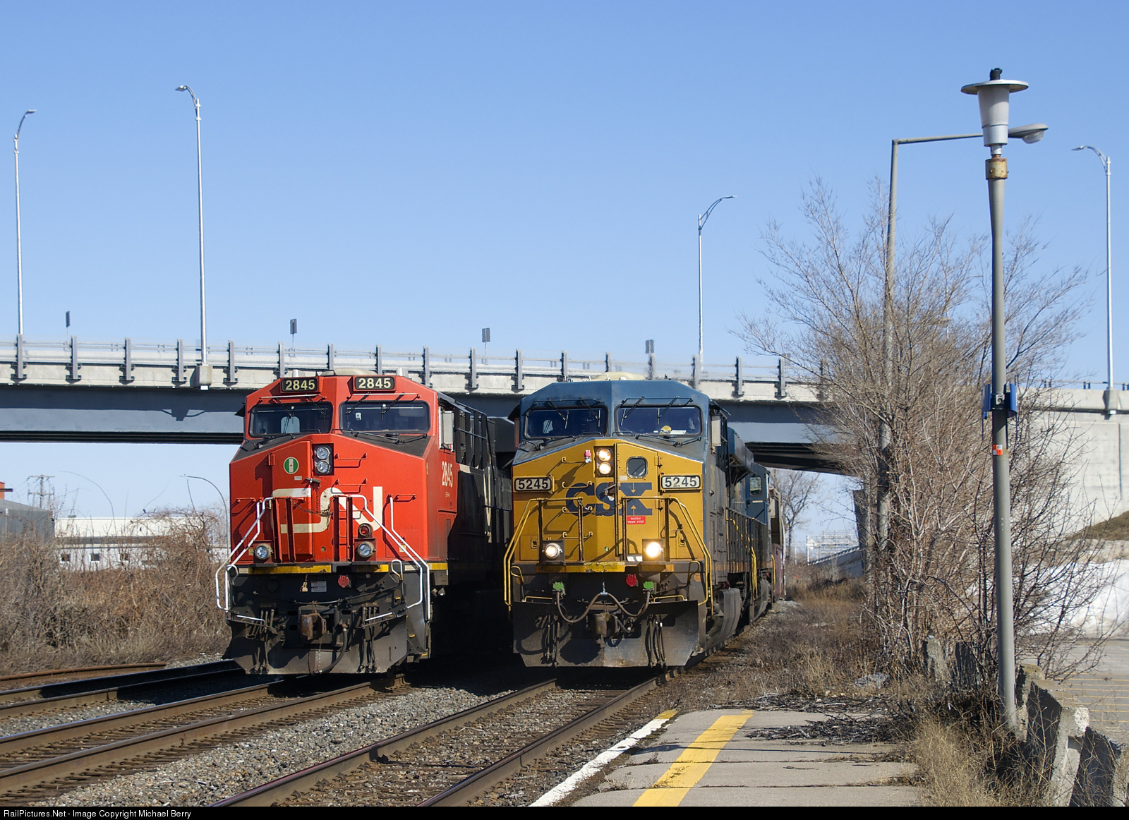 | CN 327 with the usual CSXT power is passing empty grain train CN 875, which has been at Dorval since the previous evening. Just after CN 327 passes a new crew will get onboard and get ready to take it west. |