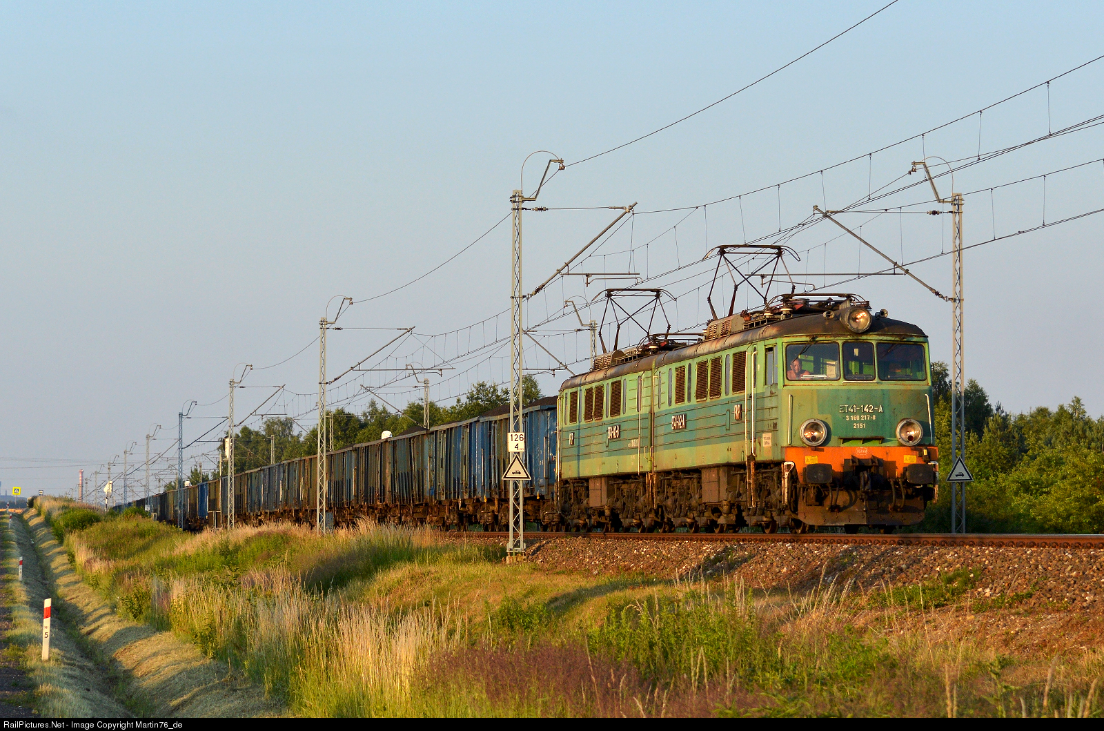 | In the glow of the setting sun, the two section electric locomotive ET41-142 hauling a freight train from Łazy ŁA to Pleszew. The train is approaching the Blachownia station. |
