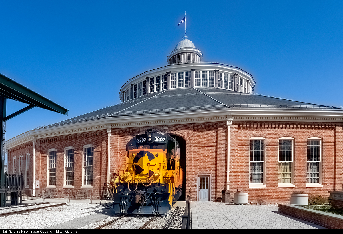 Chessie System GP38 No. 3802 exits the roundhouse at the B&O Railroad Museum with a Chessie caboose in tow after a turntable demonstration. General Motors, Electro-Motive Division constructed the locomotive for the B&O Railroad at its LaGrange, Illinois shops in October 1967. It was voted by TRAINS Magazine in 1982 as the All-American Locomotive and finally, after retirement, donated to the B&O Railroad Museum in operational condition as CSX No. 9699 in 2000.