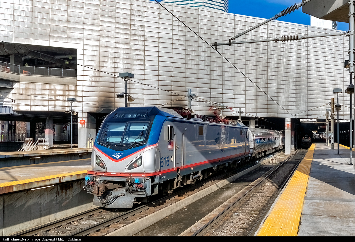 | An Amtrak Regional led by AMTK No. 616 prepares to depart Boston's South Station for New York City and points south. The iconic large white wall in the background is actually a parking garage and bus terminal built over the station tracks. |