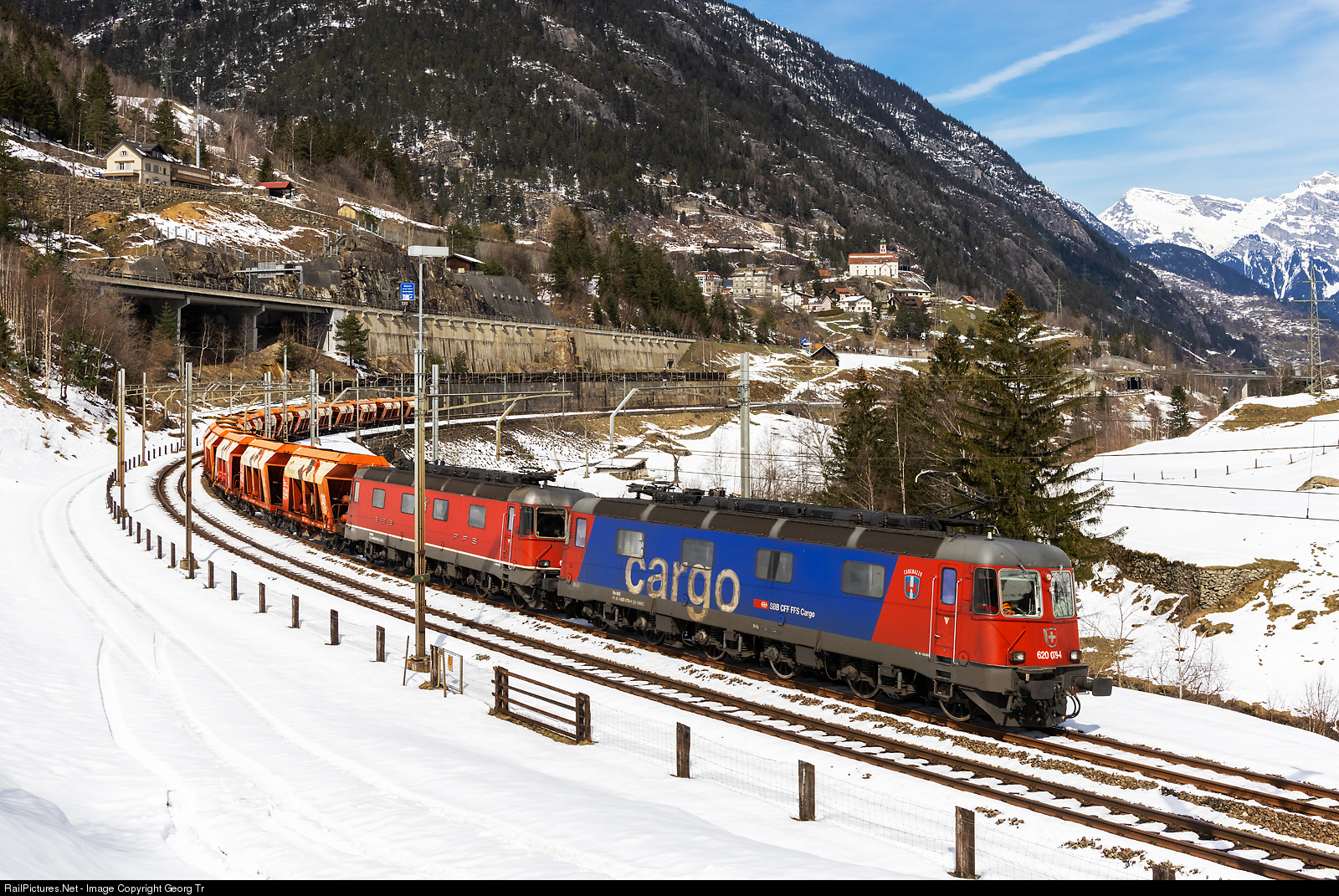 More then 21000 horsepower for the gravel train over the Gotthard to Bodio. Re 620 # 079 "Cadenazzo" (Re 6/6 # 11679) and Re 620 # 070 (Re 6/6 # 11670) in multiple control are pulling the 1280 ton gravel train with 16 cars from Hüntwangen via Bülach-Regensdorf-Brugg-Othmarsingen-Arth Goldau-Erstfeld-Göschenen-Airolo to Bodio, through the Wattinger curve between Gurtnellen and Wassen. This is the only regular freight train which is running over the Gotthard mountain line nowadays, and is circulating about one or two times per week. In the left upper corner you can see the station building of Wassen, whre the train will run through behind in about one minute in the opposite direction on the middle level of Wassen.
