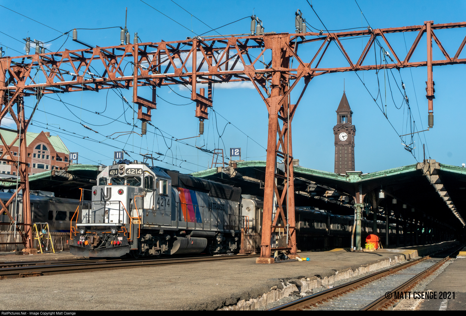 NJ Transit 4214 pulls its train out from under the shed at Hoboken Terminal, beginning its trip west. |