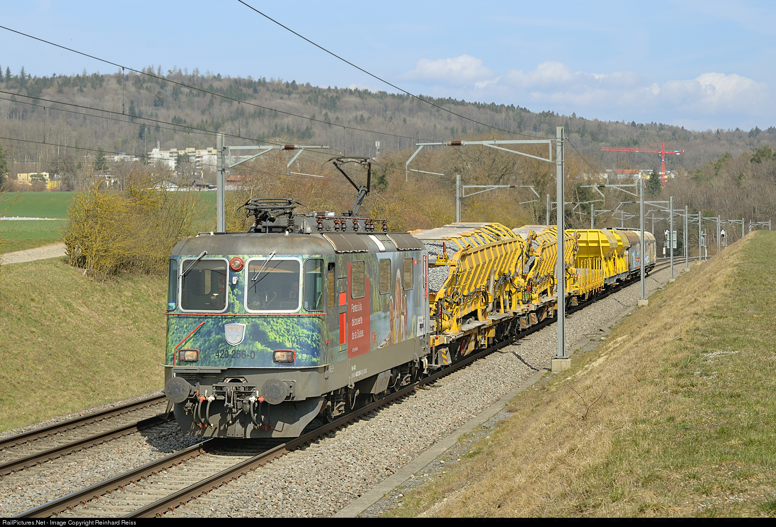 | SBB Cargo 420 256 in commercial livery "Die Schweiz entdecken" ["Discover Switzerland"] passes Jestetten area on the way from Singen to Limmattal yard. |