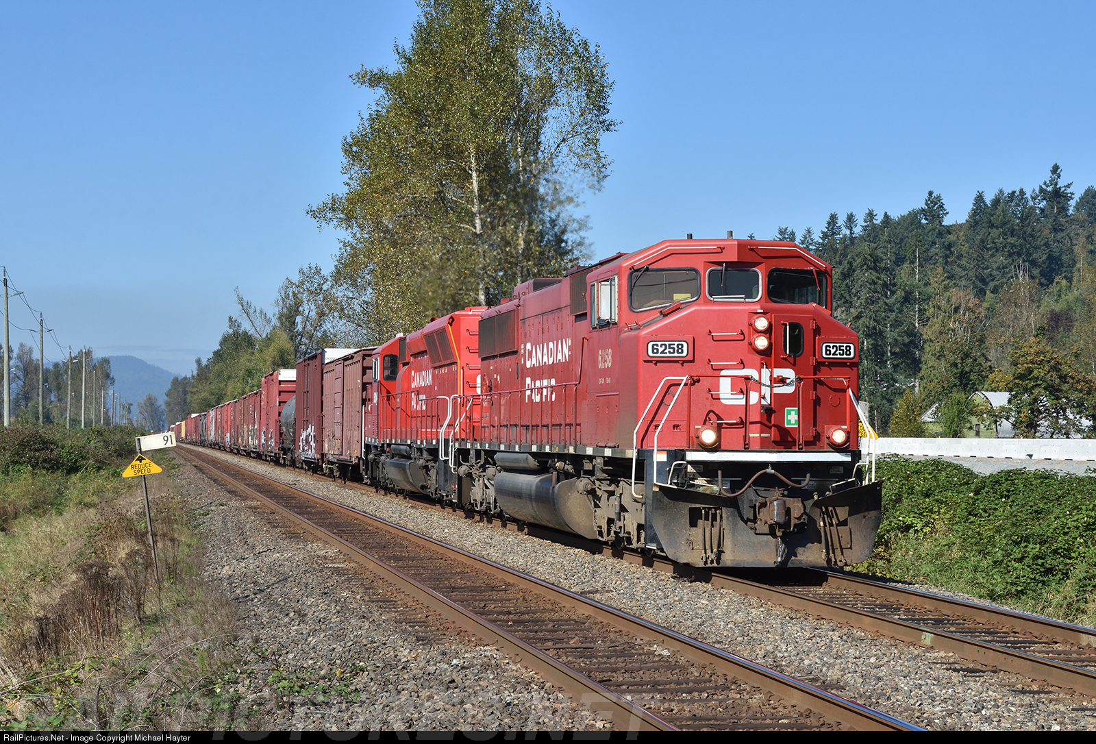 | CP 6258 leads CP V89, the daily transfer run between CP's Port Coquitlam yard and CN's Thornton Yard, east towards Mission BC. |