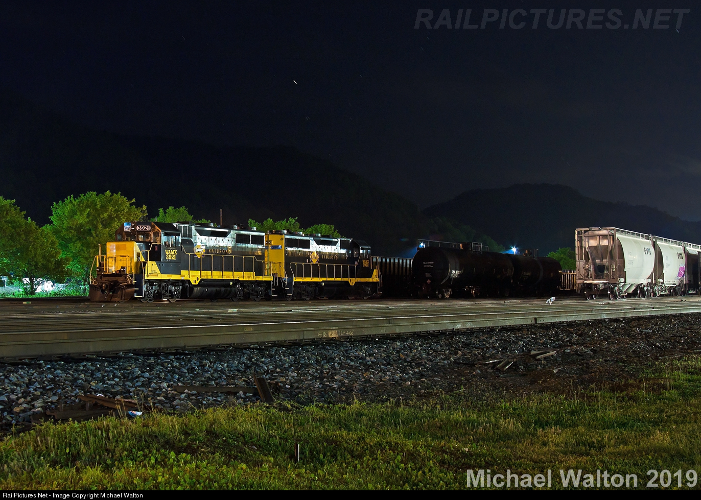 | A pair of Kanawha River Railroad GP39s sit under a mostly clear April night sky in the Kanawha River RR Dickenson Yard after a hard days work, the 3921 being a former Western Maryland GP35. |