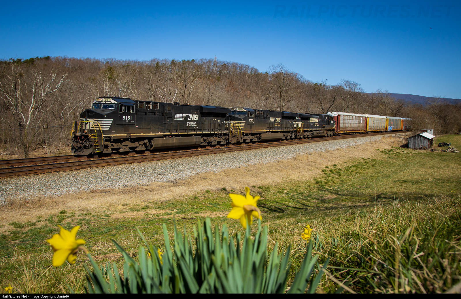 The yellow daffodils are a welcome sign of spring as NS 393 rolls west through Wabun, Va.