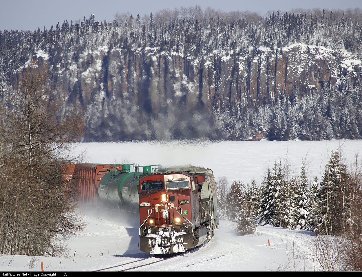 | The sheer rock walls of the Red Rock Questa, the frozen Nipigon River, the former CN Kinghorn Subdivision road bed (now a skidoo trail), and a winter wonderland surround ATP 9-421 as it carves its way along the Nipigon Sub in some frigid winter conditions. |