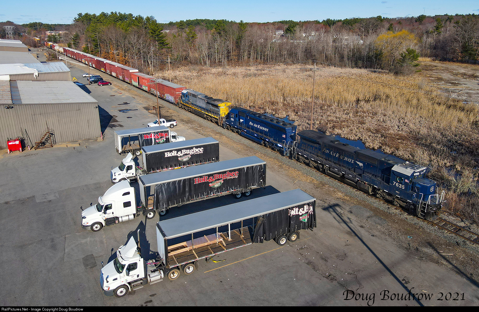 | Holt & Bugbee, manufacturers of custom millwork and flooring has been in business since 1825. The Tewksbury facility, which was opened in 1994 lies next to the Pan Am freight main. Although there is a siding it is rarely if ever used and looks to be in a state of disrepair. The competition in the foreground seems to have won this battle. Ayer to Portland freight AYPO is seen cruising by the facility about to cross Shawsheen Street. |