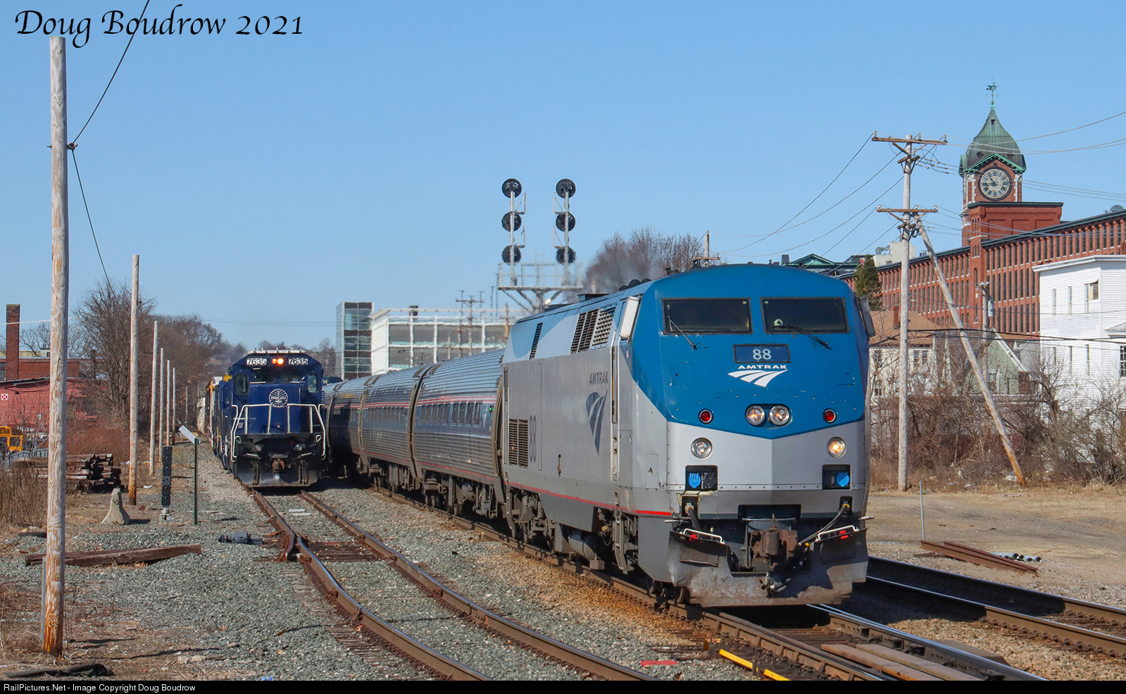 Amtrak Downeaster 691 is seen passing through Lawrence. Pan Am train AYPO is on track 17 East picking up two engines and a cut of cars before continuing to Portland.