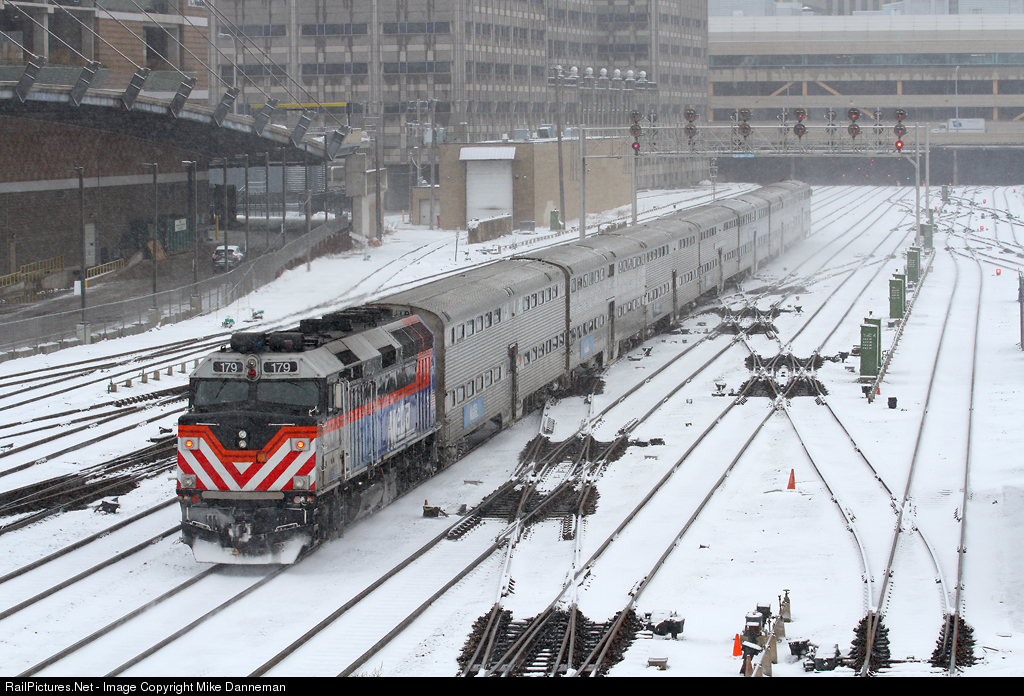 | Metra EMD F40PH-3 No. 179 powers an inbound commuter train passing through CP Taylor approaching Chicago Union Station on a snowy November 11, 2019. |