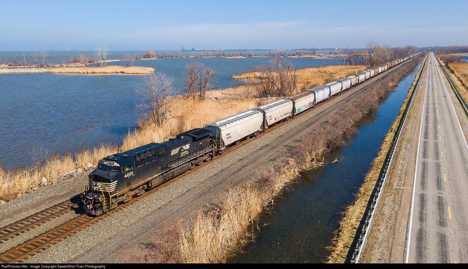NS 4220 with a sand load rolls West along the Sandusky Bay shoreline a sunny Saturday afternoon