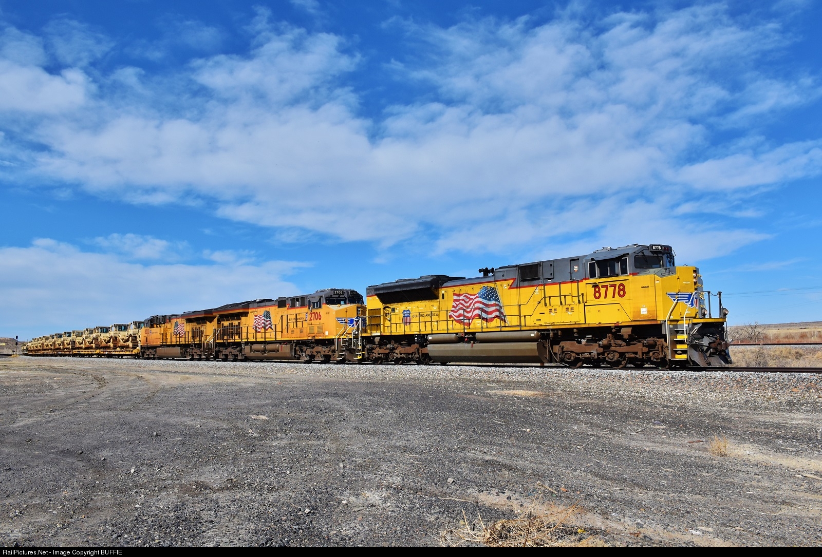 UP 8778 (SD70ACe) leads long military train through Nixon, Colorado.