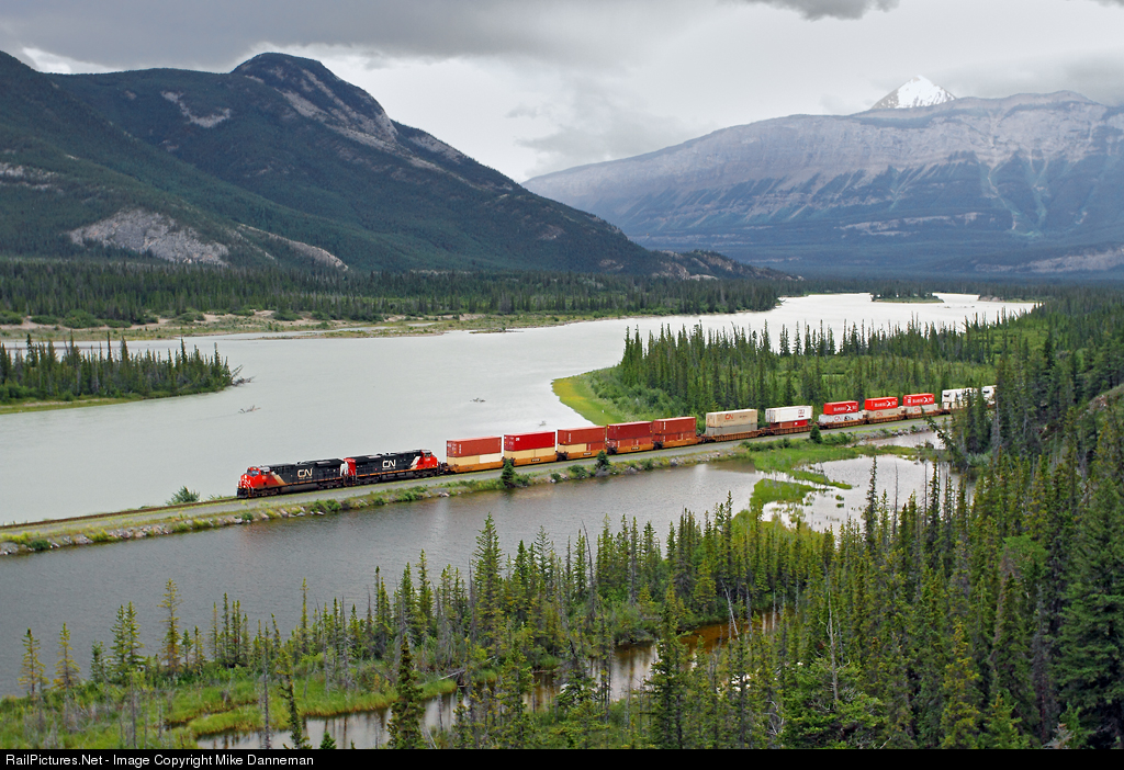 Along Jasper Lake in scenic Jasper National Park, Canadian National intermodal train 192 is eastbound at Windy Point, between Snaring and Devona, Alberta, on July 19, 2011. Powering the train is a pair of GE ES44DC units, Nos. 2311 and 2286.
