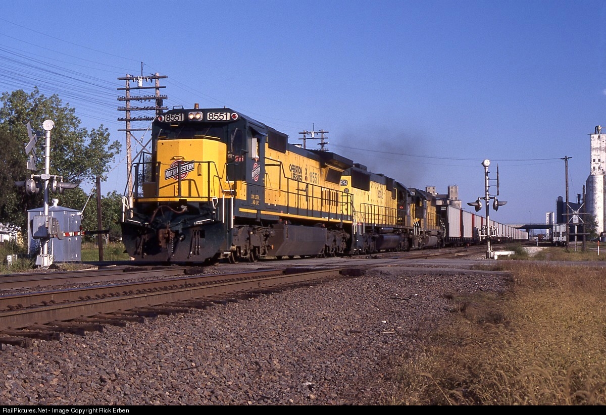 When coal trains ran in profusion, another set of empties for the Powder River basin departs Fremont, NE behind a pre-AC-era set of power: Dash8, SD60 and SD40-2 all in C&NW colors. Fuji Sensia.