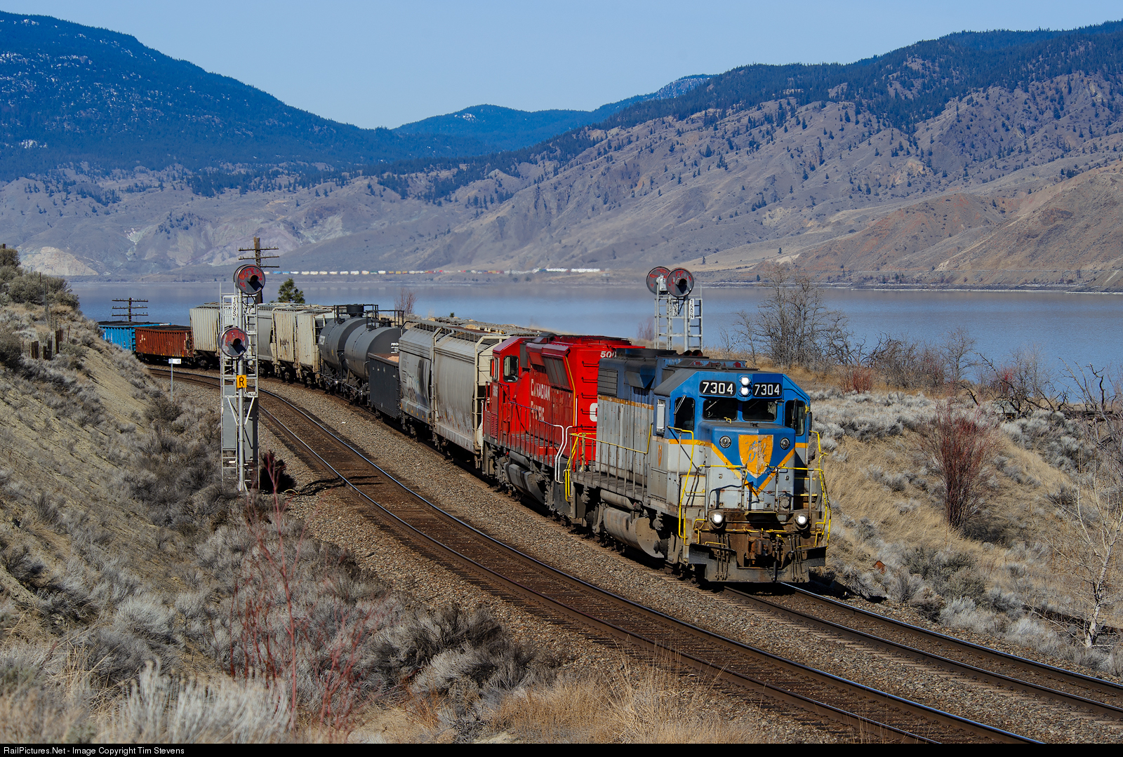 DH GP38-2 7304 and CP SD30C-ECO 5005 are returning eastward to Kamloops with the Ashcroft Wayfreight (V52-11) passing the approach signal to Cherry Creek. Kamloops Lake is in the background as well as CN's Ashcroft Sub.