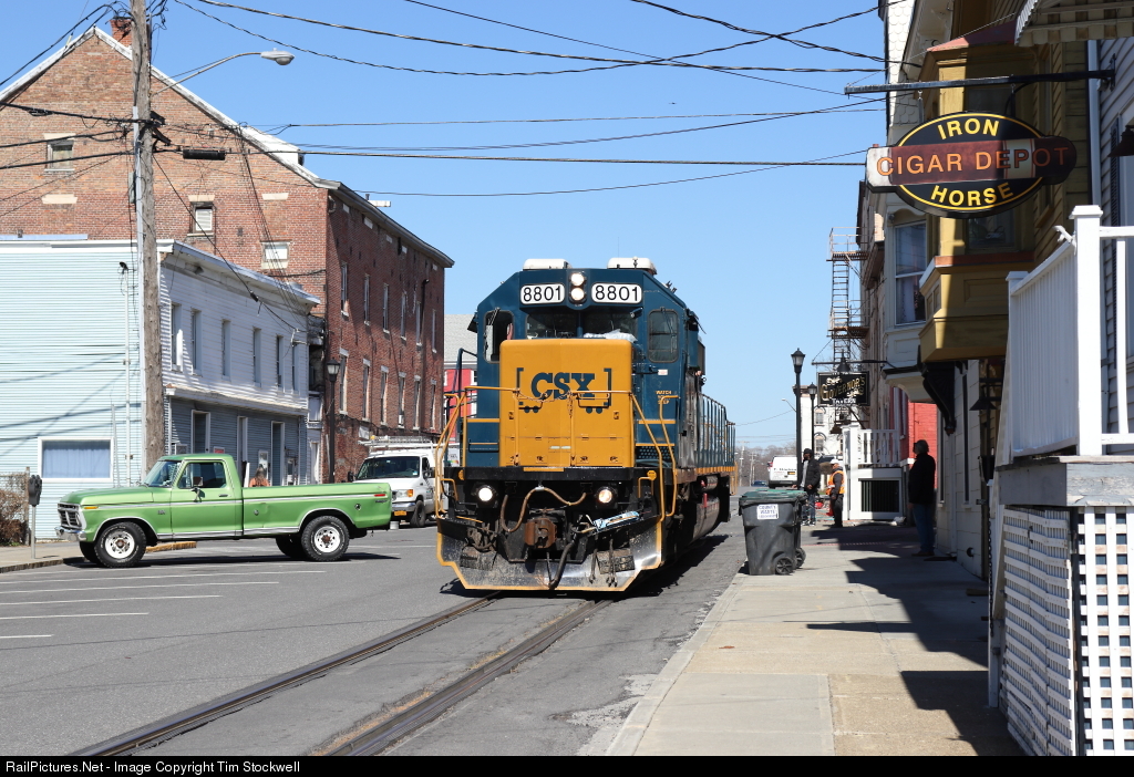 | CSX's B765 local navigates the short section of street running on South 7th Street in Hudson, NY as it returns light power after working ADM. |