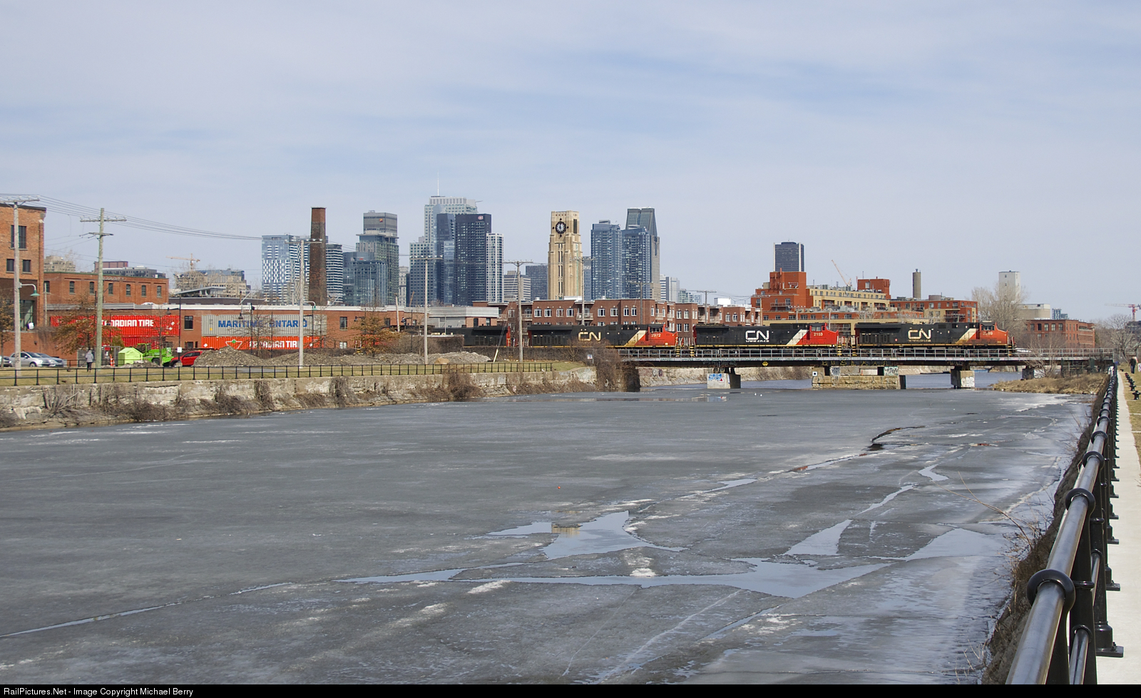 CN 120 has four GE's up front (CN 2299, CN 2153, CN 2972 & CN 2692), all different models, as it crosses the still slightly ice-covered Lachine Canal.
