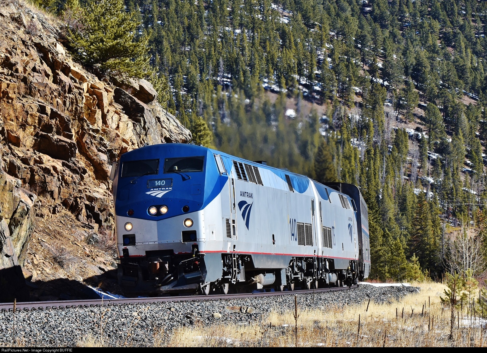 Amtrak engine #140 leads the California Zephyr around the bend at Tolland, Colorado.