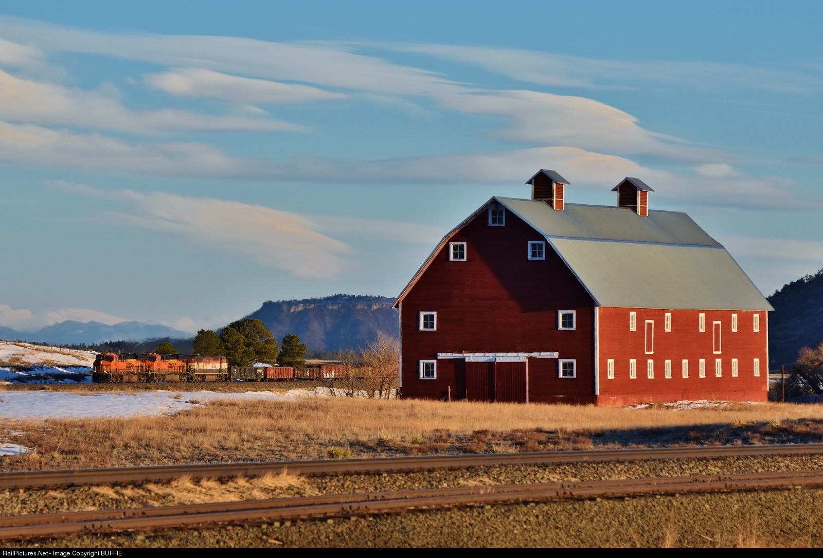The sun has just peaked over the horizon as BNSF 6551 (ES44DC) leads an early morning freight past the iconic red barn in Greenland, Colorado.
