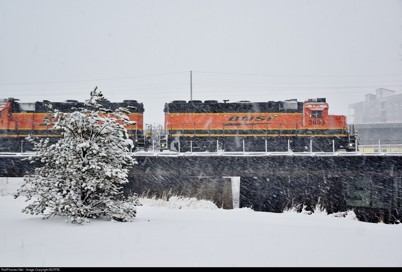 | The March Snowmageddon blizzard is in full swing as strong winds are blowing snow in all directions while BNSF 3005 moves a cut of cars for sorting in the Denver Yard. |