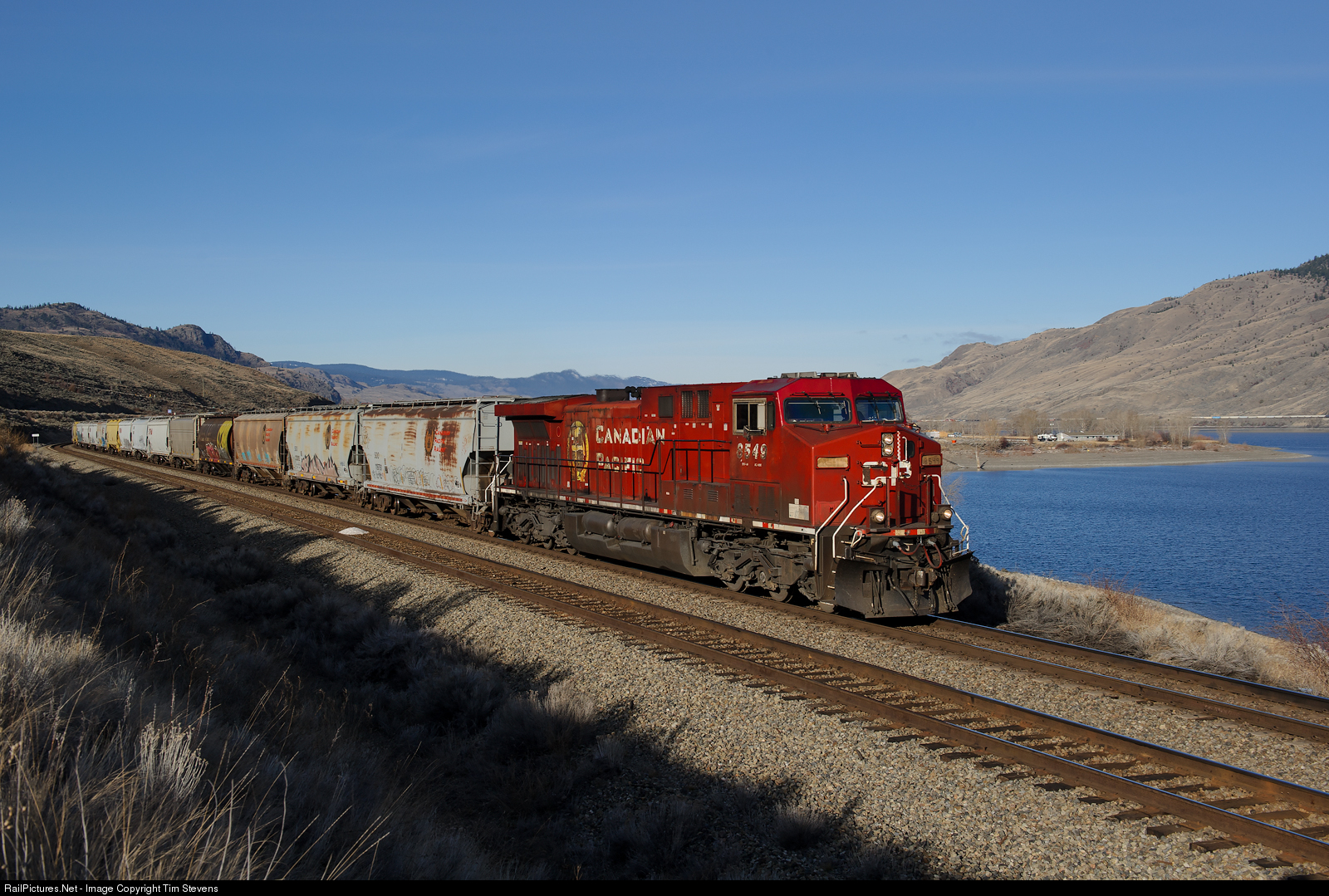 | Even with great scenery, it's hard to make CP AC4400CW 8549 look good... nevertheless, here it is leading CP's 2nd 300-22 east on the north track of the Thompson Sub between Dodge and Tunkwa. |