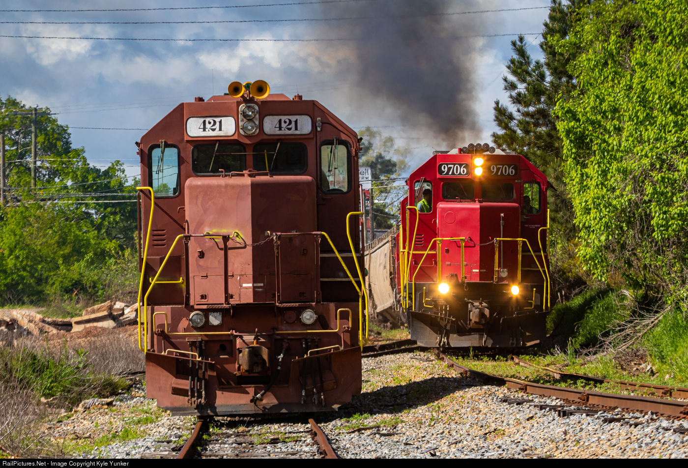| CEFX GP39-2 #421 is tied down on the short siding at Holly Springs as engineer Kenny brings a loaded grain train up the steep ruling grade on their way to Pilgrims Pride. |