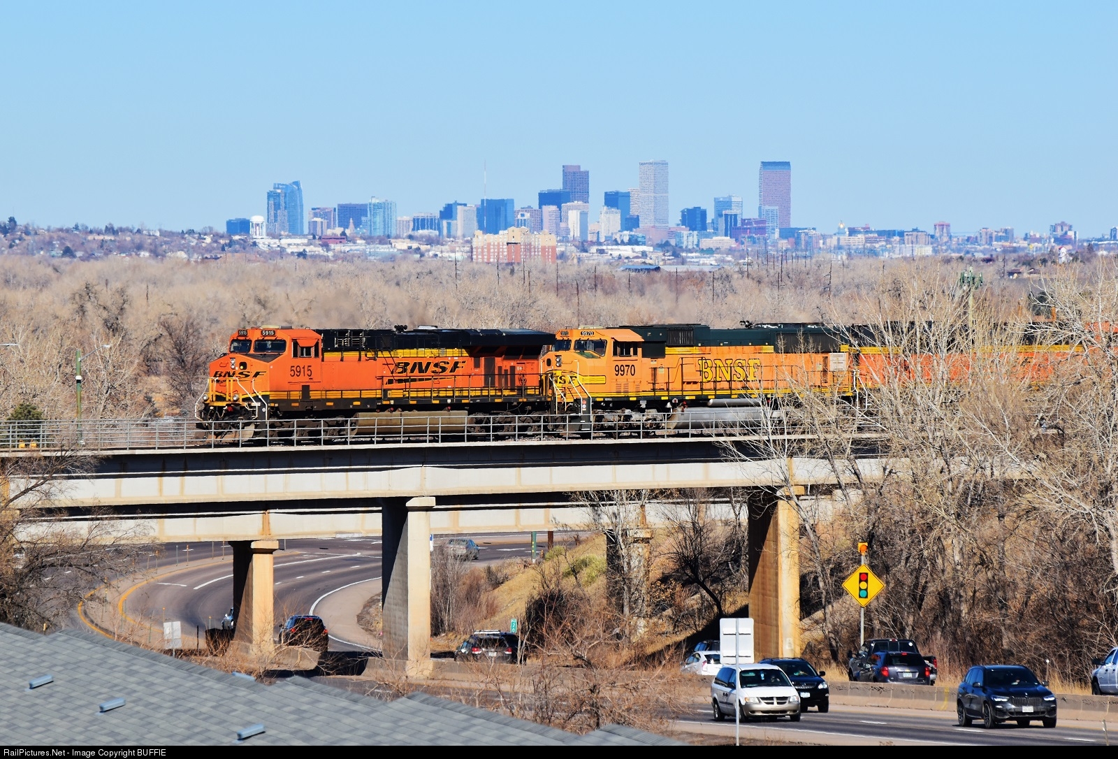 BNSF 5915 (ES44AC) muscles a freight towards the skyline of Denver, Colorado.