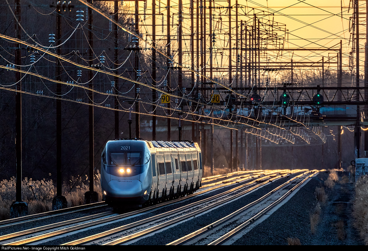 | Glinting rails and catenary illuminate the path for an eastbound Amtrak Acela Express as it barrels through Andalusia, PA. The train, ducking both the 90 mph speed restriction signs and the former PRR signal bridge, now adorned with colored position lights is en route to New York and points north by nightfall. |