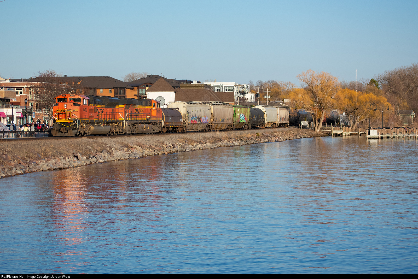 | The Laurel, MT manifest heads west past Lake Minnetonka on a bustling evening in downtown Wayzata. The conductor was waving to the onlookers in town. |