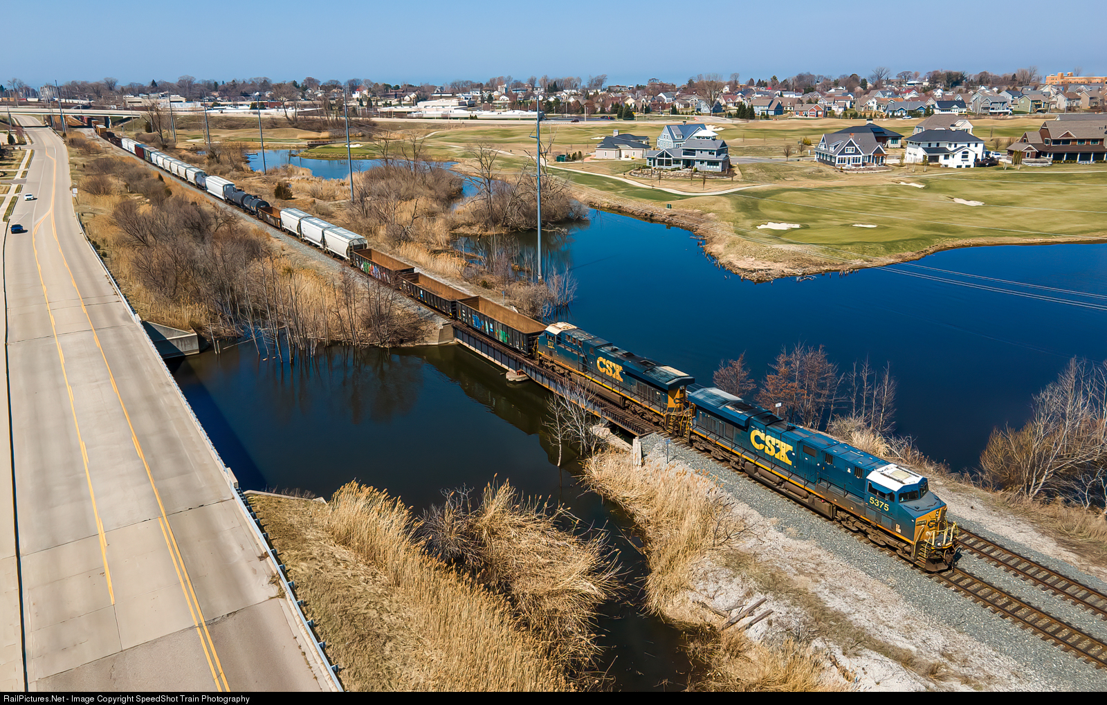 | CSXT 5375 Leads Eastbound over the Paw Paw River in St. Joseph Michigan , coming from Chicago Illinois on its way to the CSX yard in Wyoming Michigan |