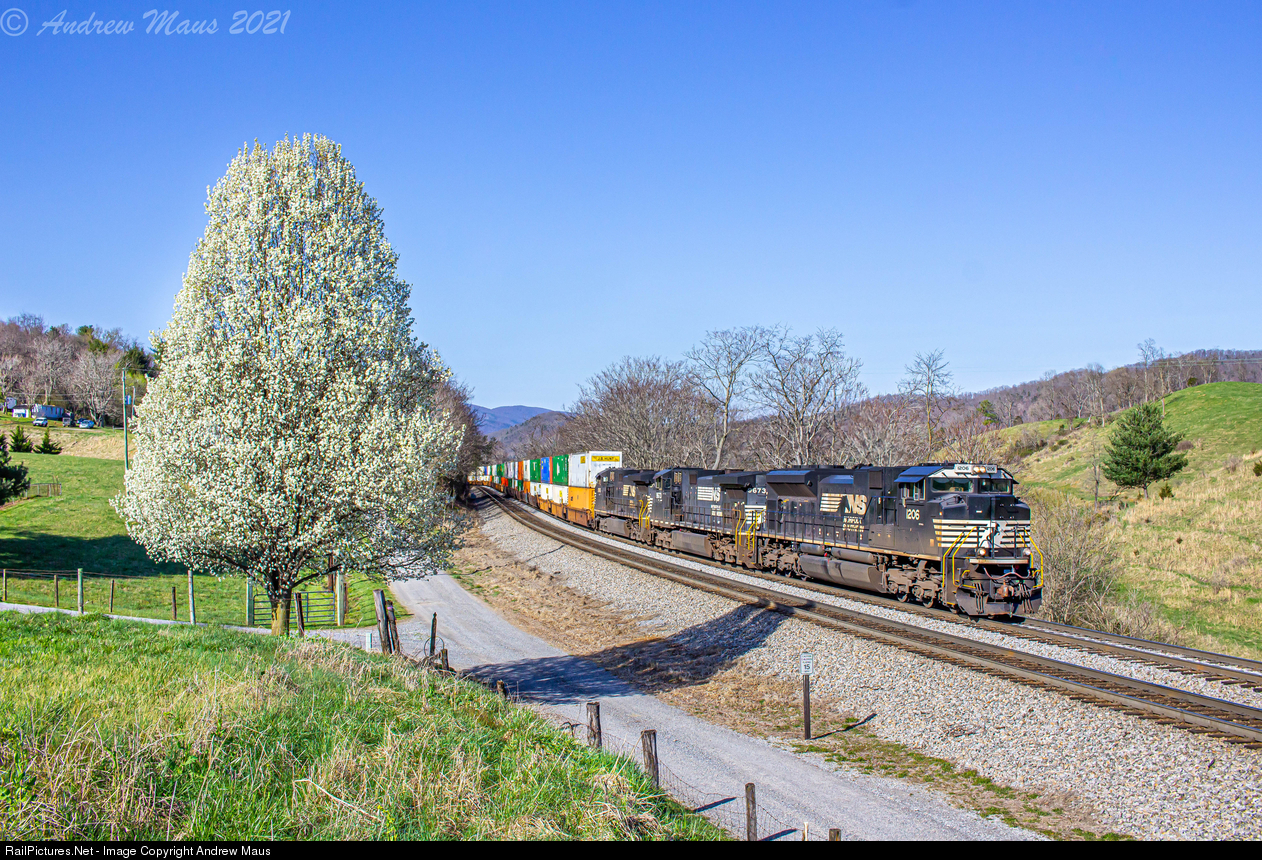 Westbound intermodal train 29G works its way up Christiansburg Grade as it makes its way past a blooming Bradford Pear tree at John Farm.