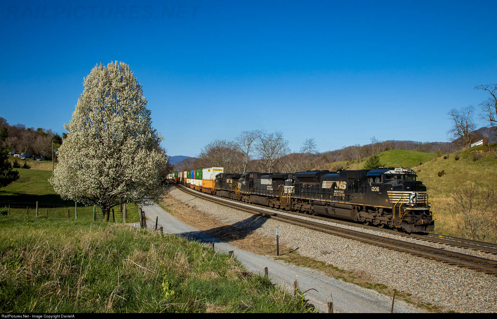 | Hotshot intermodal, NS 217, rushes up Christiansburg grade in Shawsville, Va with an ACe on point. |