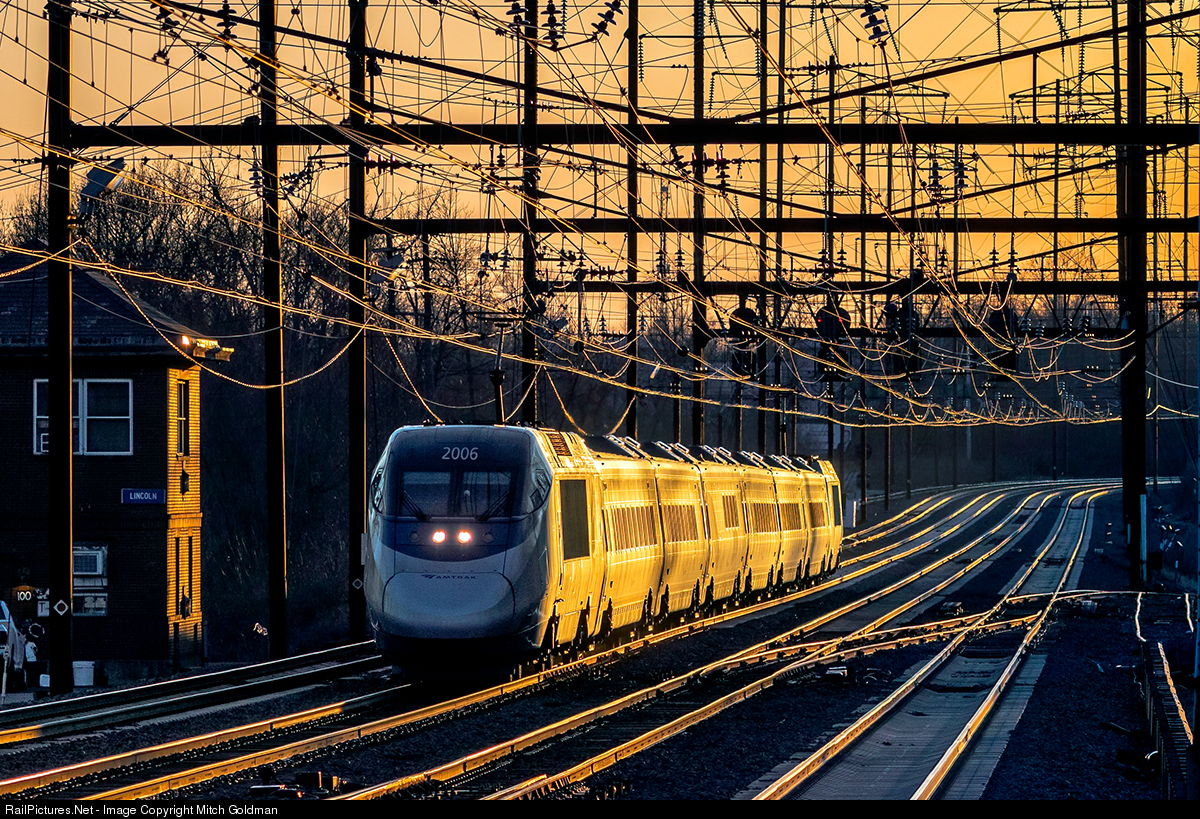 An Acela Express, led by AMTK No. 2006, charges past "Lincoln" tower, just shy of Metuchen station, in a race to make New York by night fall.