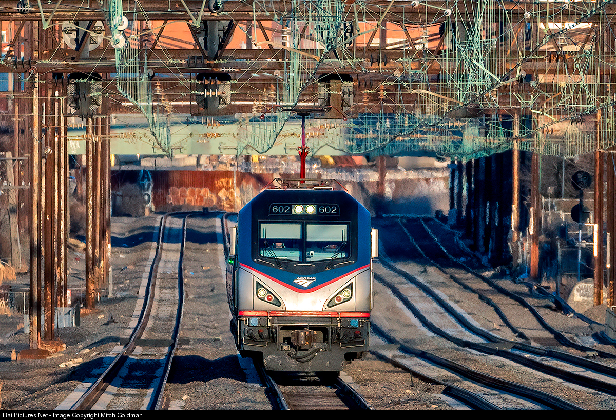 A silver bullet, illuminated by a late evening Sun, rifles down the barrel of the Northeast Corridor in North Philadelphia, traveling on track 3. The train is just shy of the North Philadelphia station. destined for 30th Street, one station stop further down the line. To the far right, a 5th track is reserved for freight trains of the Norfolk Southern.