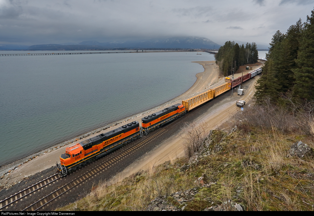 After switching and interchanging cars with the Pend Oreille Valley Railroad in Sandpoint, Idaho, BNSF’s Sandpoint local heads back west toward Spokane at East Algoma on February 4, 2021. The local has just finished crossing the long bridge over Lake Pend Oreille and is tracing the shore along Bottle Bay Road.