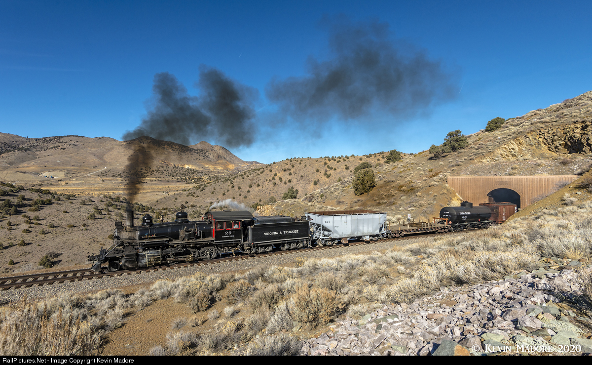 Steamscape: American Flat Tunnel (Tunnel #2). V&T Locomotive #29 charges out of the west portal of Tunnel #2, near Silver City, NV, hauling freight loads for customers in Virginia City, about 6 miles up the line. I would have used the term "ahead", but on this line, that's not exactly accurate. The train is headed compass west right now and Virginia City is off to the northeast, beyond the distant hills on the right side of the train. The most distant point on the line that you can see in this view is Gold Hill, and that's located in the distance just above the cab. Yes, that's where she's going. The route is anything but direct. It's no wonder that this railroad was nicknamed the "crookedest shortline in America."