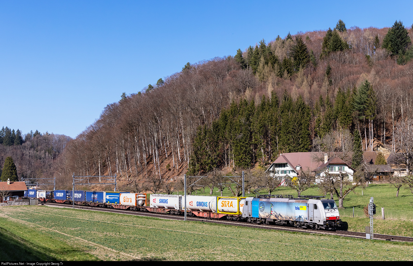 | Bombardier TRAXX F140 MS 186 # 103 of Railpool, rented to the BLS Cargo since 2013, is pulling the southbound intermodal train from Gent/Belgium via Lötschberg-Simplon to Mortara/Italy, between Wynigen and Burgdorf. |