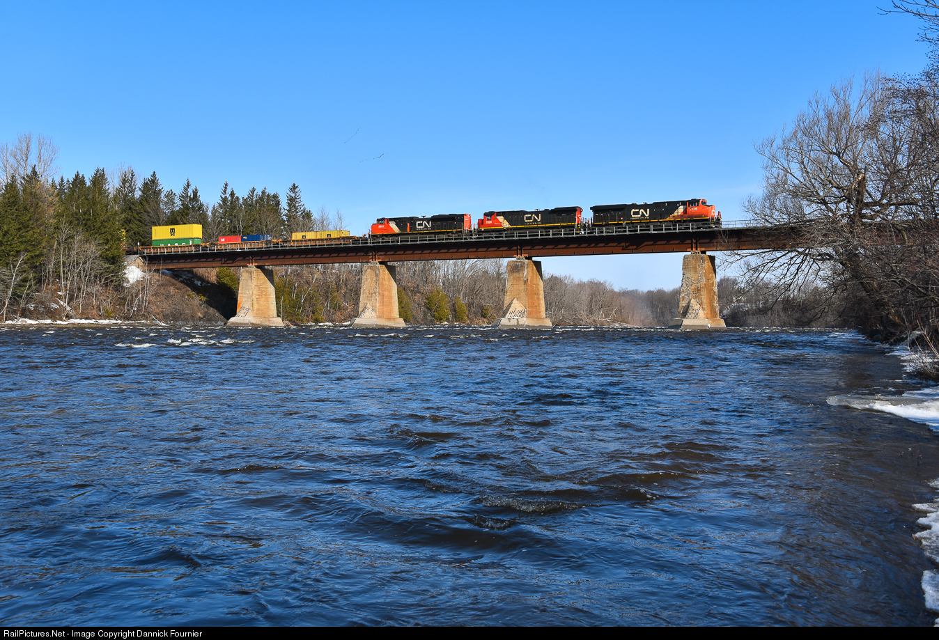 On a beautiful afternoon, CN 306 rumbles across the Etchemin River bridge