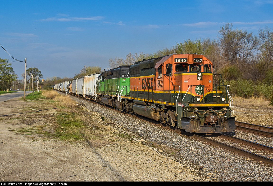 A pair of SD40-2’s take one of BNSF’s ‘Joliet locals’ (train Y-JOL202) based out of Joliet Yard. Seen here heading west out of town, and making their way towards Blodgett, Illinois to work INEOS Styrolution America LLC, DUPONT, Hoffman Transportation and various other industries a couple of miles to the southwest of town. The lead SD40-2, BNSF #1842 wears the BNSF H1 scheme while the trailing SD40-2, BNSF #1706 still wears its Burlington Northern green.