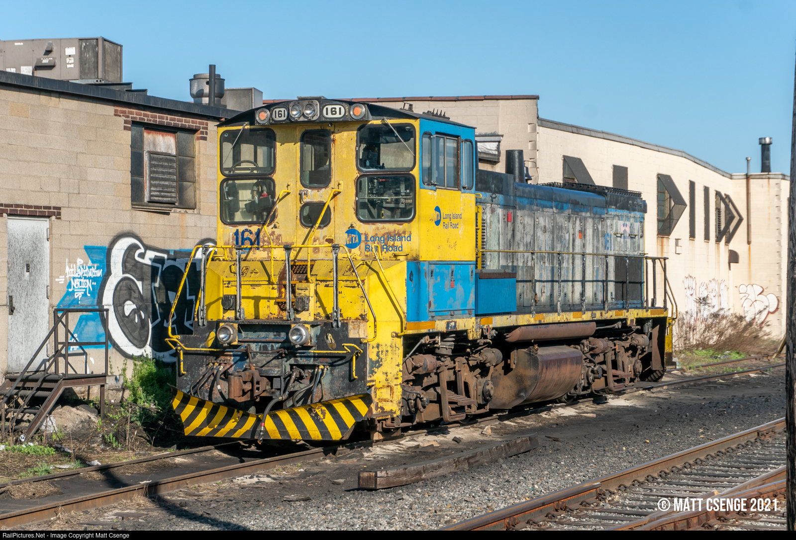 LIRR 161 idles on a siding track near Long Island City Station on the Lower Montauk Branch. There is typically a locomotive here, presumably as a protect unit for the terminal.