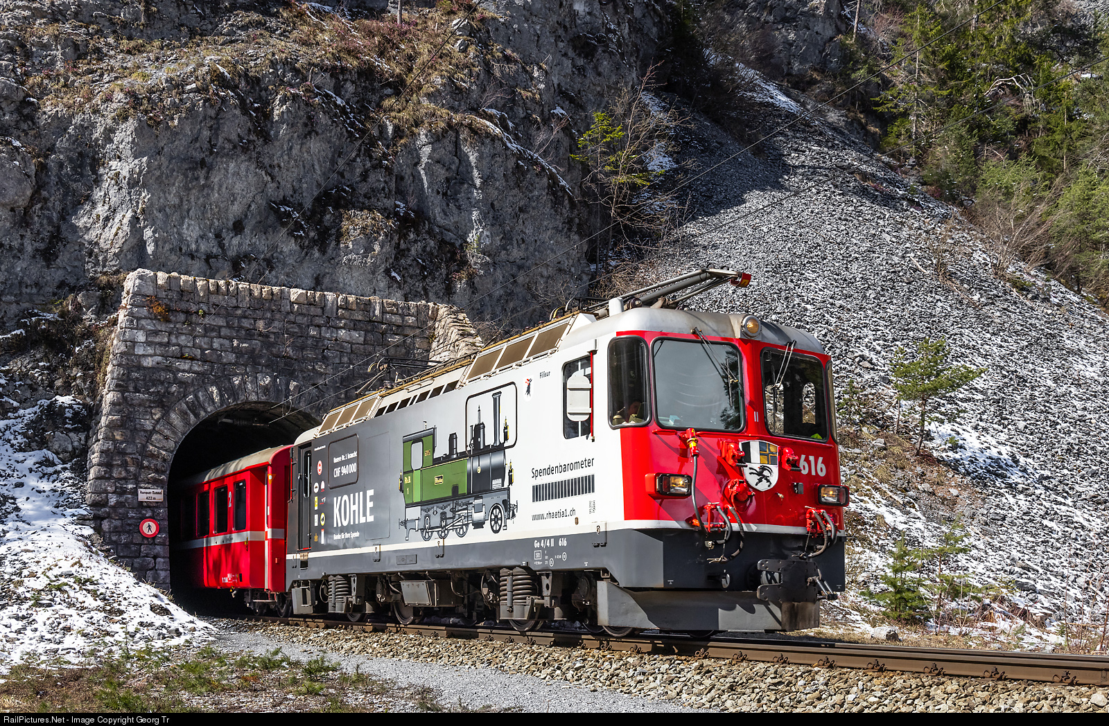 Ge 4/4 II # 616 "Filisur" of the Rhaetian Railway, in the special publicity paint scheme for the collection of donations for the steamlocomotive G 3/4 # 1 "RHAETIA" of 1889. The locomotive is also called "the coal locomotive" because the term coal is also used colloquially for money. As you can see, the donation barometer on the locomotive side is completely filled with 19 briquets, so 19 x 50000 = about 950 000 francs were collected for the restoration of the very first locomotive of the Rhaetian Railway respectively its predecessor company Landquart-Davos-Bahn (LD). This was a joint campaign of various railroad associations under the umbrella of RhB Historic with support from the Rhaetian Railway. The locmotive is leaving the 422 meter long Ransun tunnel in the gorge of the Vorderrhein (Ruinaulta) between Versam-Safien and Trin, pulling the Regio Express 1732 from Disentis-Mustér via Ilanz-Reichenau-Tamins-Chur to Landquart, and further as RE 1241 via Klosters-Vereina tunnel to Scuol-Tarasp.