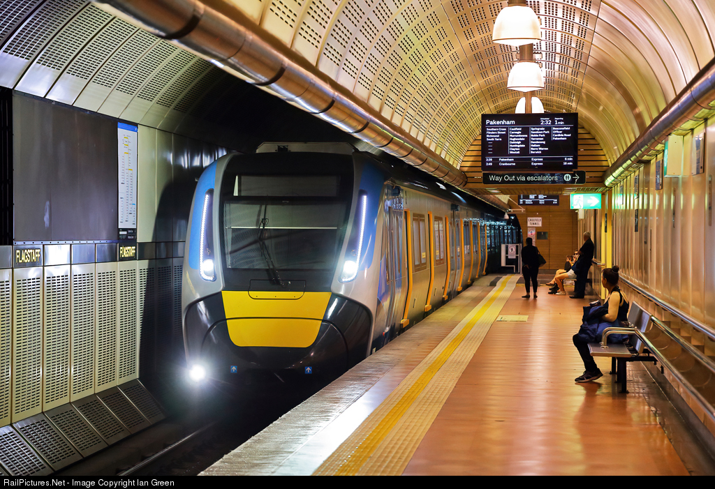 A new HCMT set running a Pakenham to Flinders Street service arrives at Flagstaff Station in the Melbourne underground loop.