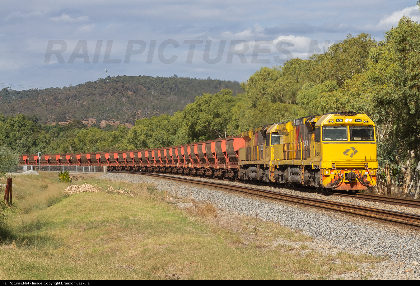 | ACB4401 and ACB4403 fly through Bellevue using full dynamic brakes with 5048 loaded Iron Ore from Koolyanobbing to Kwinana bulk terminal. |